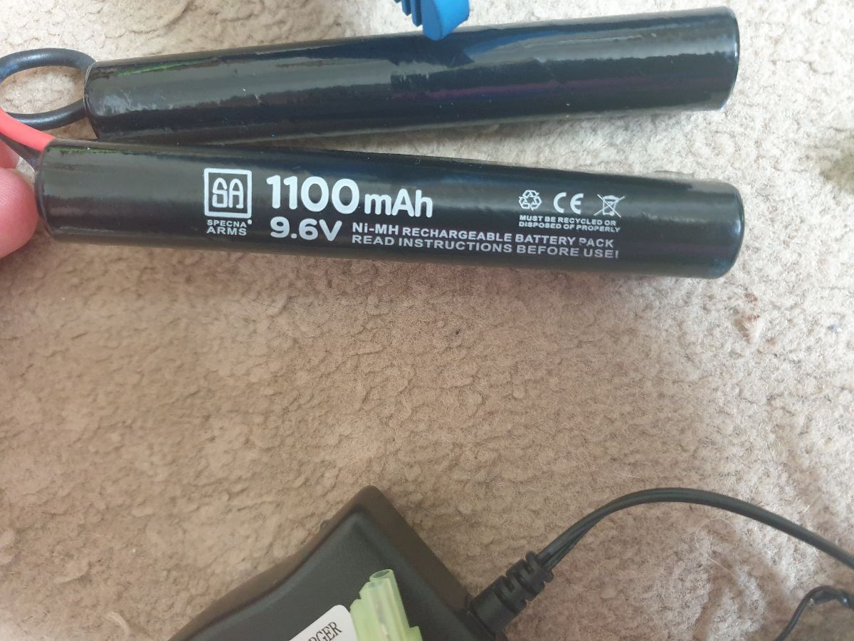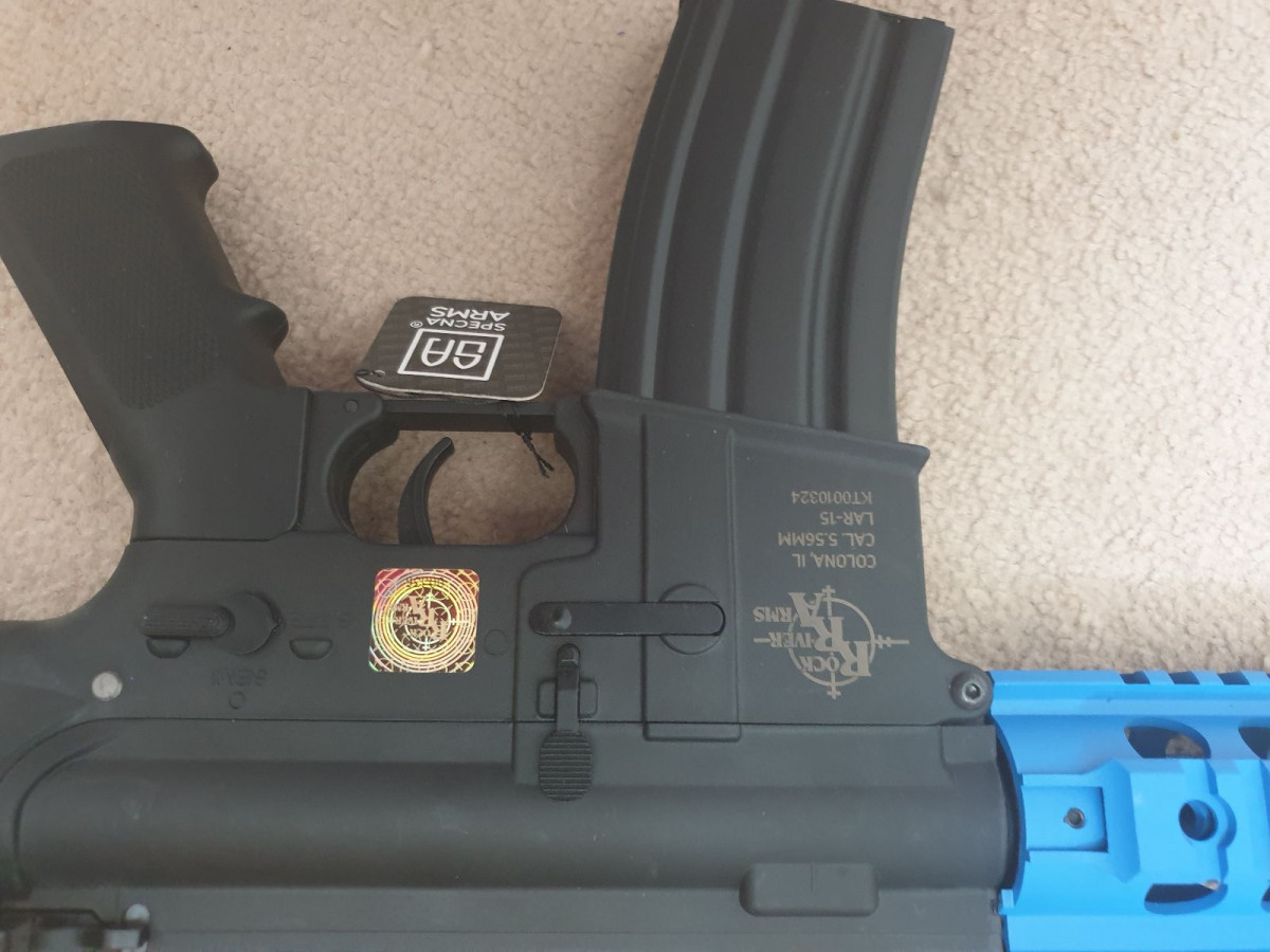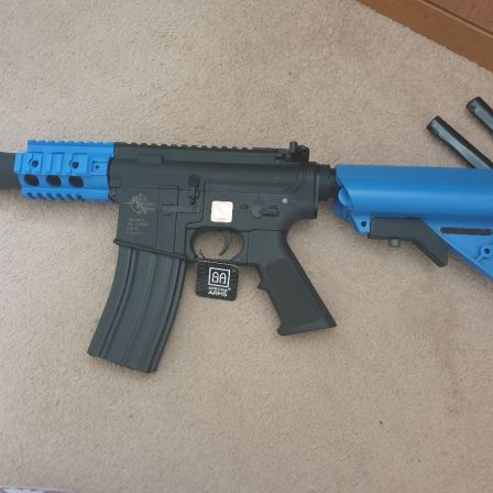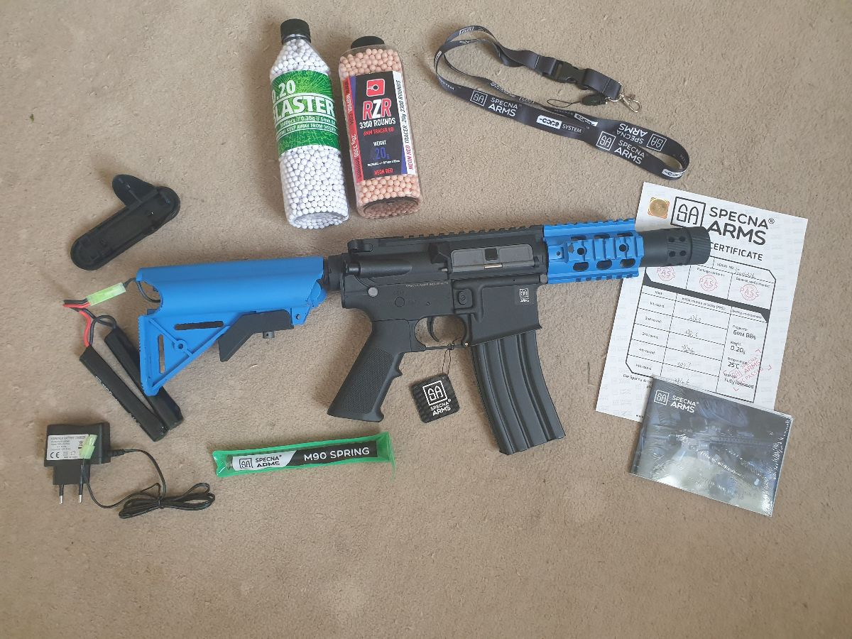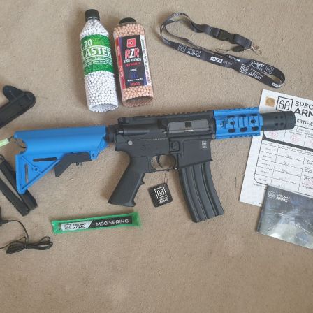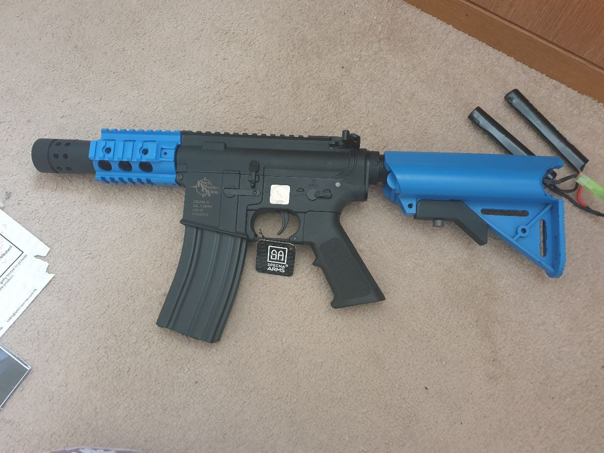 Excellent condition, barely used Specna Arms M4 Replica, blue 2-tone, comes with all extra's listed above, as well as original magazine, battery and charger.