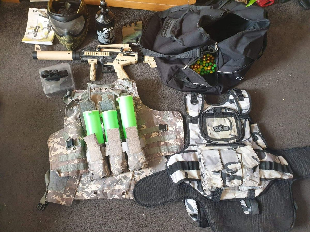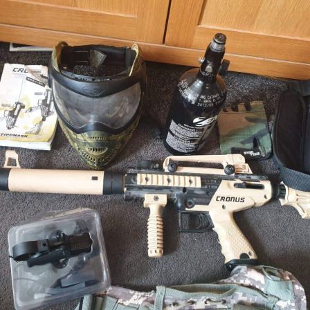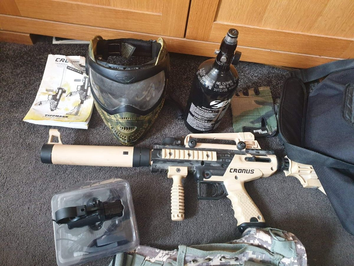 Cronus Paintball gun with accessories/ mask, body armour x2, camera plus over 500 Paintball pellets