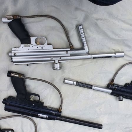 Tippmann A5 gun with comp air bottle Goggles with full head protection Cammo gear x2 Belt and 3 bottles Gloves …