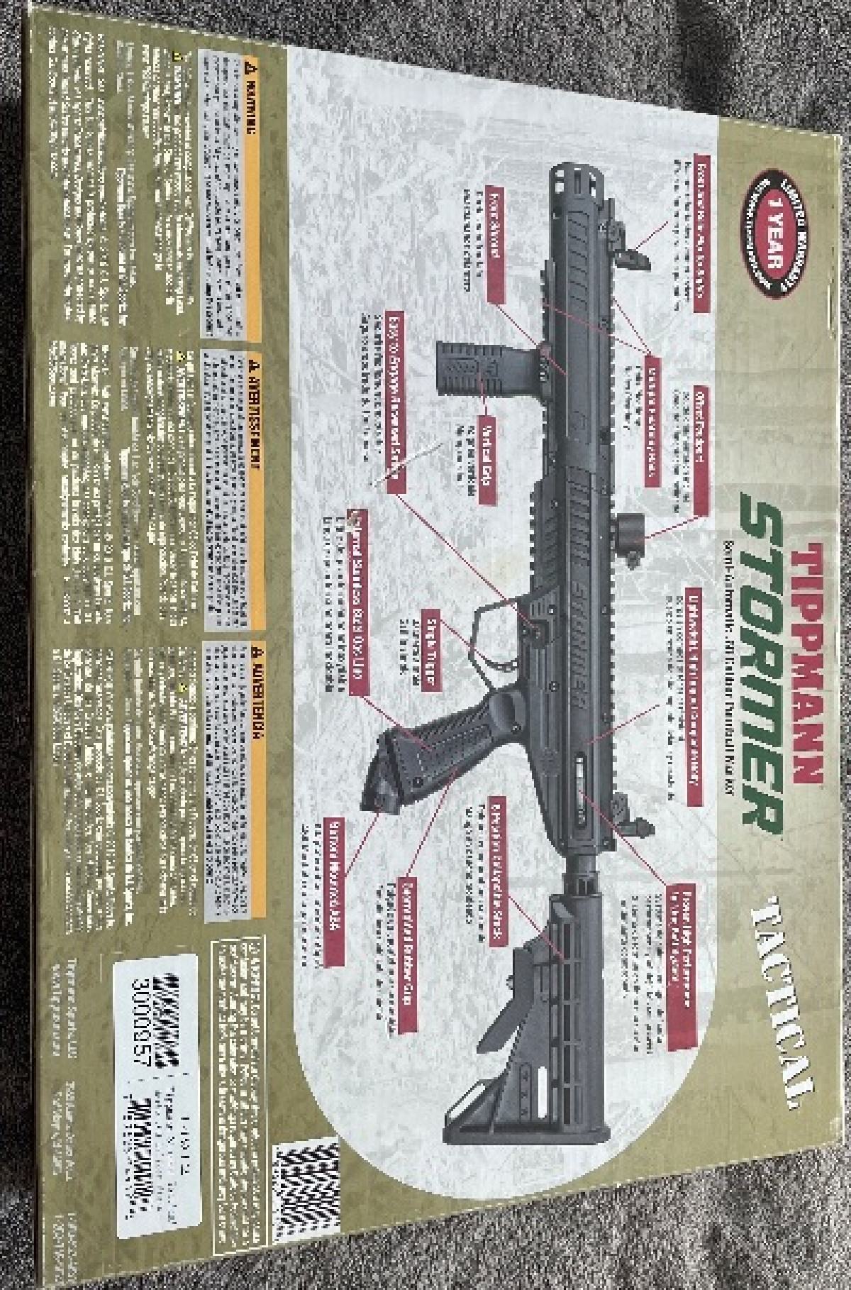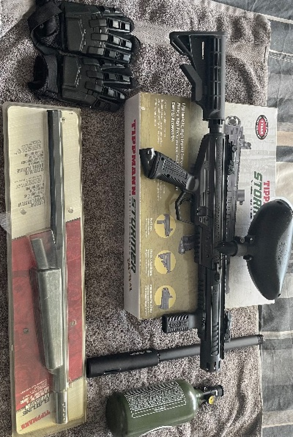 This is my Tippmann Stormer Tactical, Semi Automatic .68 Caliber Paintball gun, Used twice so still is excellent condition, comes with protective trousers and Shirt in size XL, 2 Barrels, one never used as it didn’t fit this gun, Mist free paintball mask, the top of the mask it’s slightly bent due to it being stored together with other items, Protective gloves and the gas canister, message for more details
